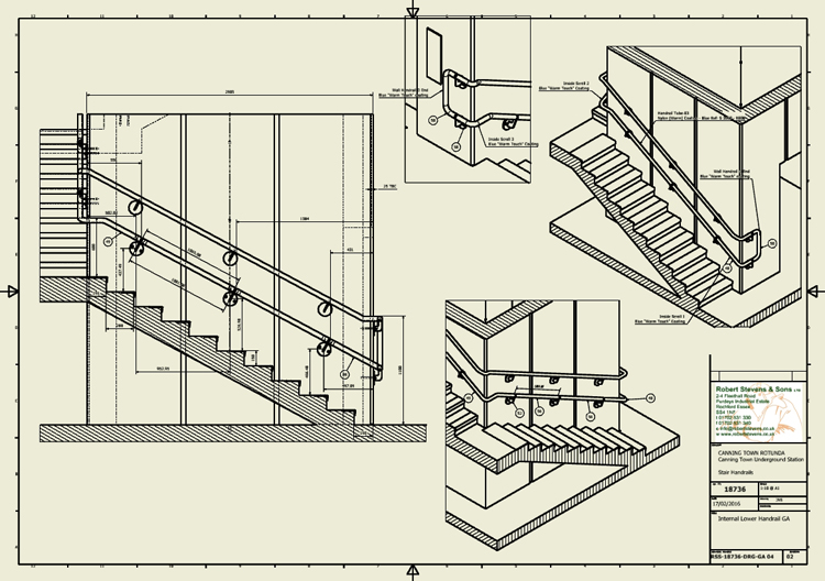 In early 2016 2TA was contracted by Essex based Robert Stevens & Sons Ltd to provide assistance in the provision of design development and fabrication details for new handrails to the public stair case at Canning Town Station